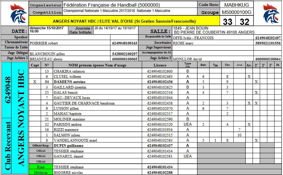 Dans le cadre de la 6ème journée du championnat Nationale 1 Masculine, Angers-Noyant était opposé à l’Élite Val d’Oise. Dans ce match entre les deux premiers du championnat, l’enjeu pour les noyangevins était de prendre ses distances avec son adversaire du jour et d’obtenir une sixième victoire en autant de matchs. En face, en cas de victoire, les Parisiens auraient pris la place de leaders. Autant dire que ce match était un rendez-vous très important pour les deux équipes, en vue de l’accession à la poule haute. Mais que ce fut un match à rebondissements, où les locaux se sont imposés dans les toutes dernières secondes, grâce à un sang froid à toute épreuve du jeune Wilhem Clusel, buteur décisif (33-32).