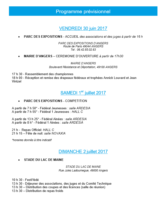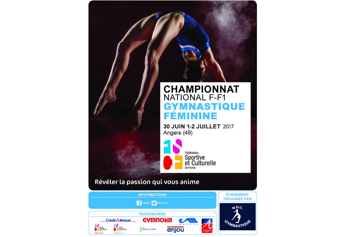 Le club de la NDC Gymnastique organise le Championnat National de Gymnastique féminine F-F1 par équipes, les 30 juin, 1er et 2 juillet 2017 à Angers. La compétition aura lieu le samedi 1er Juillet au Parc des expositions d’Angers et le palmarès le dimanche au Stade du Lac de Maine. Nous attendons plus de 1700 gymnastes, environ 650 accompagnateurs et 250 juges.