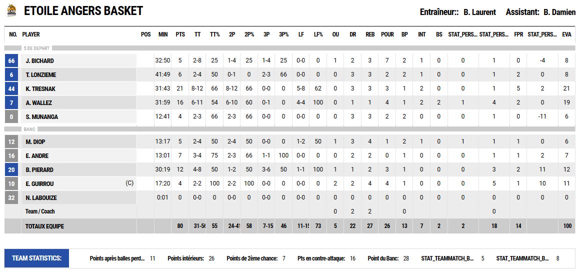 Étoile Angers Basket : Munanga (4), Lonzième (6), Wallez (16), Guirrou (cap) (4), Diop (5), André (7), Pierard (12), Labouize (0), Tresnak (21), Bichard (5). Entraîneur : Laurent BUFFARD.