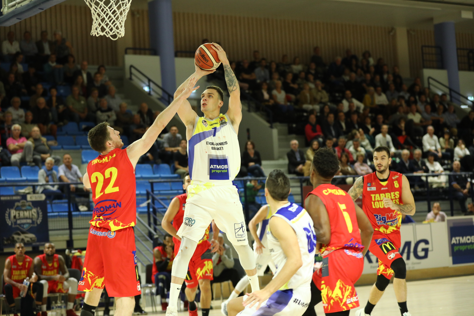 El Yazid GUIRROU (capitaine de l’Étoile Angers Basket) : « Après cette première mi-temps catastrophique où l’on a été dominé, on a montré que l’on était un vrai groupe, en se disant les choses à la mi-temps. On s’est dit que l’on ne pouvait pas faire pire et qu’il fallait avoir un minimum de fierté et réagir en deuxième mi-temps, surtout devant un public qui s’était déplacé en nombre. On a la chance d’avoir la possibilité de se dire les choses entre nous et de se regarder les yeux dans les yeux. Il faut continuer à travailler, car on a été plus dans la réaction que dans l’action. Autre sujet, même si je n’aime pas trop parler de l’arbitrage, mais il faut avouer qu’il n’a pas été toujours en notre faveur. Certaines décisions litigieuses ont cassé certaines de nos actions. Mais sur cette première mi-temps, on ne peut s’en prendre qu’à nous-même. Cependant, pour revenir au match, je ne pense pas que beaucoup d’équipes auraient eu une telle réaction devant le leader du championnat, en revenant à leur hauteur. Maintenant, il va être important de bien récupérer en vue du match contre la Rochelle, car le fait d’enchaîner les matchs n’est pas évident pour les organismes. On doit retenir cette deuxième mi-temps et repartir sur une bonne dynamique, dès vendredi. »