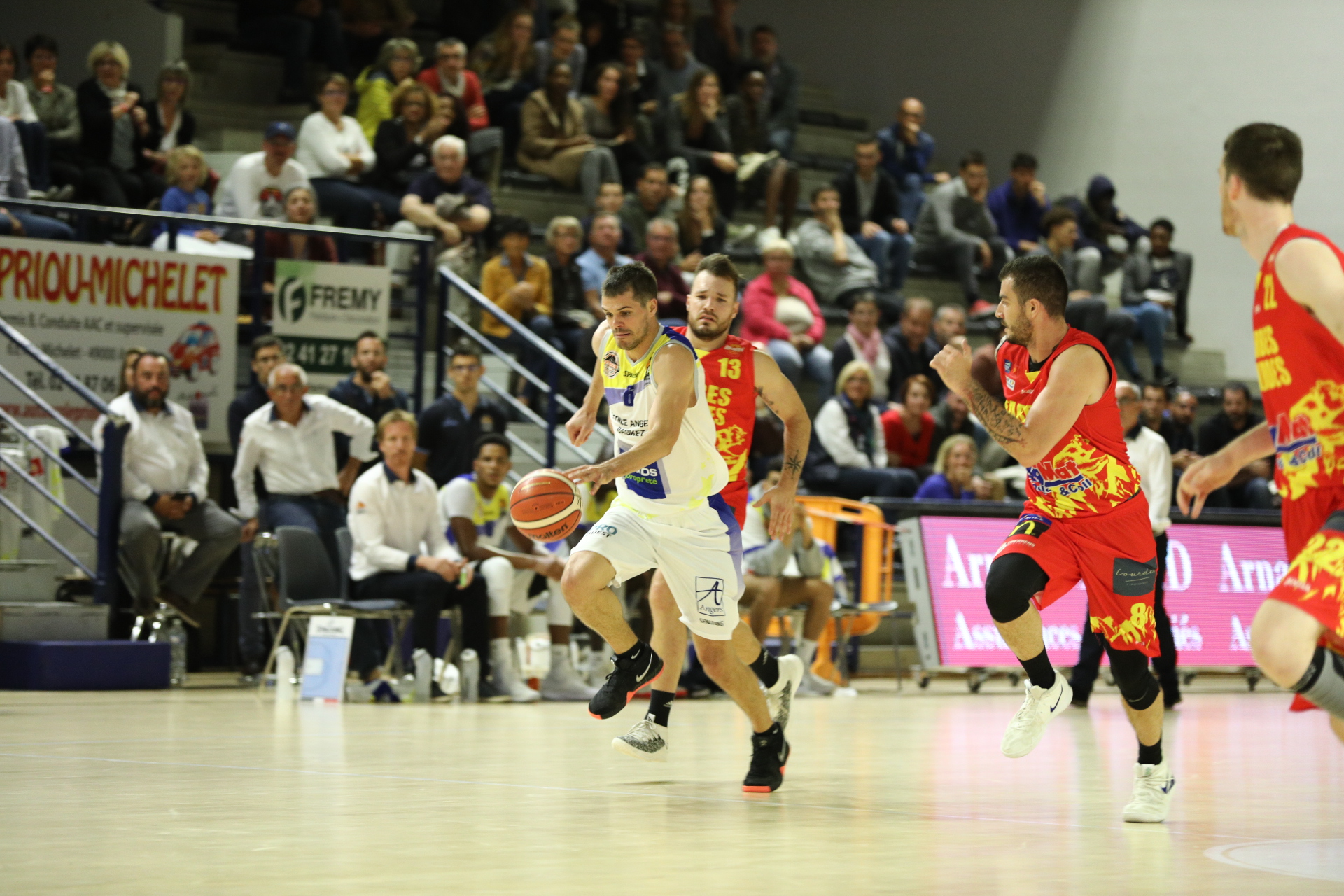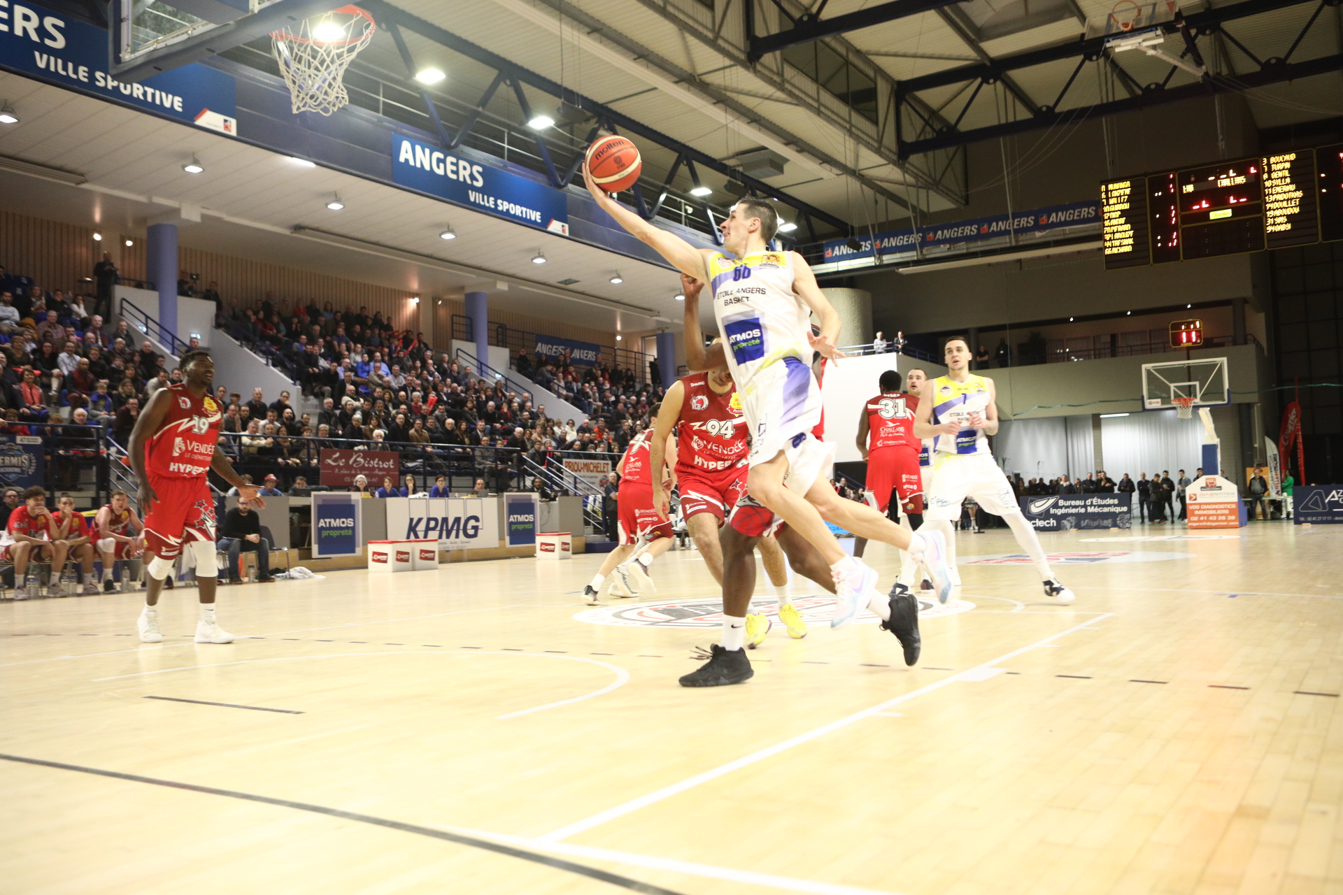 Le coup d’envoi du match est donné par Sébastien Château, le double champion du monde de Full-Contact 2018. Certainement inhibés par l’évènement, les Angevins sont rapidement menés au score et les Vendéens creusent l’écart, à l’image de l’ancien Angevin, Douillet qui conclut un 8-0 d’entrée de jeu (0-8, 2’41). Il faut attendre plus de trois minutes pour voir le premier panier local (2-8, 3’18). Bichard enchaîne à trois points, puis Tresnak profite d’une belle passe de Munanga pour recoller dans la foulée au score (7-8, 4’19). Pridotkas calme les ardeurs adverses avec une réussite à trois points (7-11, 4’22). André rentre dans la danse avec un trois points face au cercle et sans opposition (10-15, 6’29). Turpin, à la suite d’une action bien construite, lui répond à la même distance, au buzzer (10-18, 6’58). Puis, à la suite d’une action tout en vitesse, Sims inscrit son jumpshot (12-20, 8’05). André inscrit son deuxième trois points de la soirée (15-20, 8’24). Sylla va donner dix unités d’avance à son équipe en fin de premier quart-temps (17-27, 9’31). Sur une interception, Bichard part seul au panier et réduit l’écart (21-30, 11’11). Mais Turpin glace la salle avec un nouveau trois points qui fait mal à ses adversaires (21-33, 12’00). Puis bien servi par Bichard, Diop s’envole pour inscrire un dunk dévastateur, qui fait soulever la foule (23-33, 12’39). Pridotkas est oublié sous le cercle et ne se prive pas pour marquer un panier facile (23-25, 14’12). Turpin, puis Pridotkas continuent leur festival sur les tirs extérieurs (25-43, 16’05). Angers réagit, par l’intermédiaire de Lonzième au buzzer (27-43, 26’32). Entouré par quatre Angevins, Douillet arrive à faire la différence en prenant le rebond offensif et à marquer sous le panier (27-45, 16’50). Gentil ponctue la mi-temps par deux lancers-francs réussis (27-49, 19’35).
