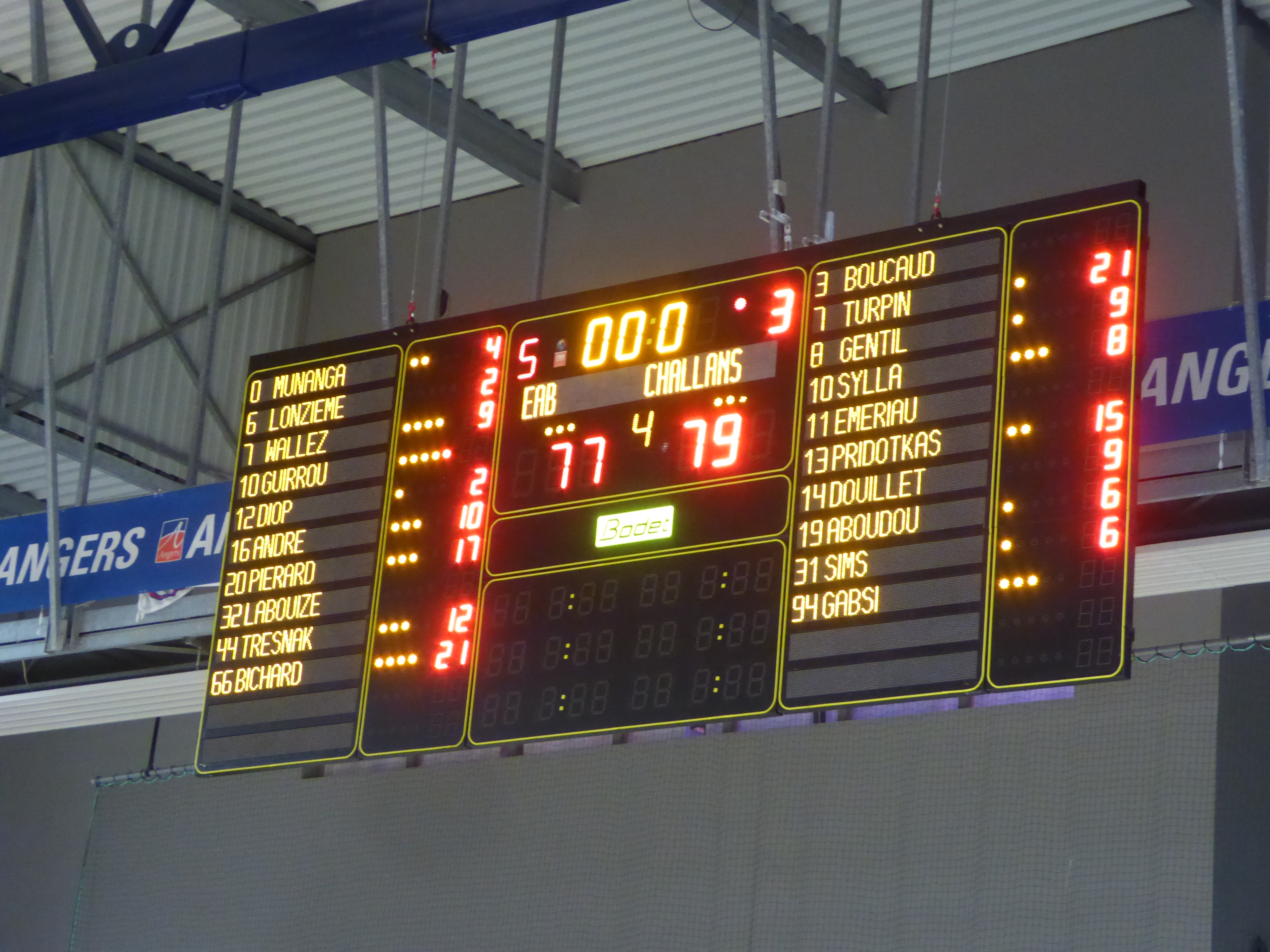 Après une première mi-temps manquée, on ne pouvait s’attendre qu’à une réaction de la part d’Angevins, trop timorés dans cette première période. Dans ce début de deuxième mi-temps, Challans maintient son écart de vingt points, malgré les deux tirs primés de Pierard, puis de Bichard. Ce dernier remet cela et on sent à ce moment-là, que le scénario du match n’est pas encore figé (44-57, 26’23). C’est lui qui ramène son équipe à dix points, sur un service de Pierrard (49-59, 28’33). Le dunk rageur de Tresnak fait se lever le public qui commence à croire à l’exploit (51-59, 29’10). Sims calme le public d’un tir au buzzer (51-61, 30’00). Pierard redistribue les cartes en inscrivant un nouveau trois points, sur une nouvelle passe de Bichard (54-61, 31’32). Encouragés par un public qui donne de la voix, André, puis Wallez recolle leur équipe à une possession (58-61, 33’31). Mais les Vendéens n’ont pas dit leur dernier mot et n’ont pas l’intention de lâcher un match qu’ils ont dominé depuis le début, et Aboudou, puis Sylla calme le public avec deux réussites, derrière la ligne des 6,25m, pour remettre un écart de dix points (59-69, 35’19). L’entraîneur angevin, Laurent Buffard, demande le temps-mort. L’EAB gère mal ses possessions de balle par trop de précipitation, ce qui profite à son adversaire. Les deux équipes étant très en réussite sur les tirs extérieurs, Turpin répond à Wallez (64-72, 36’20). Le capitaine angevin, El Yazid Guirrou, sort pour cinq fautes (37’10). Puis, à la suite d’une interception, Bichard remonte le terrain et sert idéalement Pierard à deux points (70-74, 37’48). Le money-time va devenir irrespirable et à suspense ! Pierrard encore lui, remet Angers à deux points (74-76, 38’53), puis à un petit point, sur un tir à trois points, à seize secondes de la fin du temps réglementaire (77-78, 39’44). Temps-morts vendéen. Angers joue mal le coup, en concédant une balle sortie de l’aire de jeux. Bichard stoppe le jeu en faisant faute sur Sylla. Ce dernier ne réussit qu’un lancer-franc sur deux (77-79, 39’50). Angers a la balle de match en cas d’une réussite à trois points, ou la balle pour arracher la prolongation, en cas de réussite à deux points. Buffard demande alors son troisième temps-mort pour organiser cette dernière possession du match et celle décisive dans cette fin de rencontre. Au final, Challans défend bien, empêchant Angers de prendre un panier facile dans la raquette, obligeant par la même occasion Bichard à tenter deux tirs à trois points, mais sans réussite. Après une première mi-temps complètement manquée, Angers est passé tout près de l’exploit, face à un leader vendéen, qui est passé tout proche, quant à lui, de la correctionnelle (79-77).