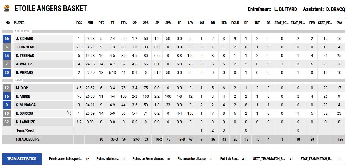 Étoile Angers Basket : Munanga (9), Lonzième (2), Wallez (14), Guirrou (cap.) (14), Diop (6), André (11), Pierard (18), Labouize (0), Tresnak (16), Bichard (5). Entraîneur : Laurent BUFFARD.