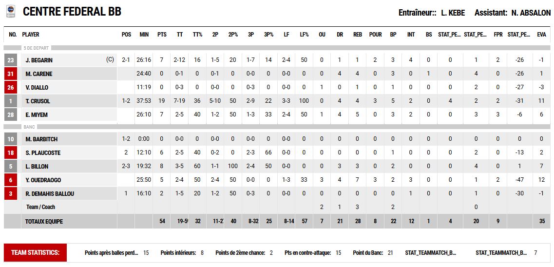 Centre Fédéral Basket-ball : Crusol (19), Demahis Ballou (2), Billon (8), Ouedraogo (5), Barbitch (0), Plaucoste (6), Begarin (7), Diallo (0), Miyem (7), Carene (0). Entraîneur : L. KEBE.
