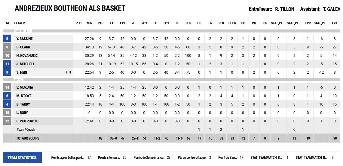 La réaction d’après-match de Morgan BELNOU (entraîneur de Brissac Aubance Basket) : « C’est une réelle performance d’avoir été gagné à Andrézieux ! Surtout avec seulement sept joueurs valides, avec les absences de Mamadou Sy, Jb Macé et Matthieu Robin ! On a été plutôt bien défensivement, mais on n’a pas validé ces bons stops défensifs, car on a laissé 17 rebonds offensifs qui ont coûté 23 points… C’est se mettre en danger tout seul, surtout sur un match à l’extérieur ! Maintenant, cette victoire à l’extérieur sera validée si l’on gagne contre GET Vosges vendredi à domicile ! Mais que cela fait du bien de la prendre à l’extérieur ! »