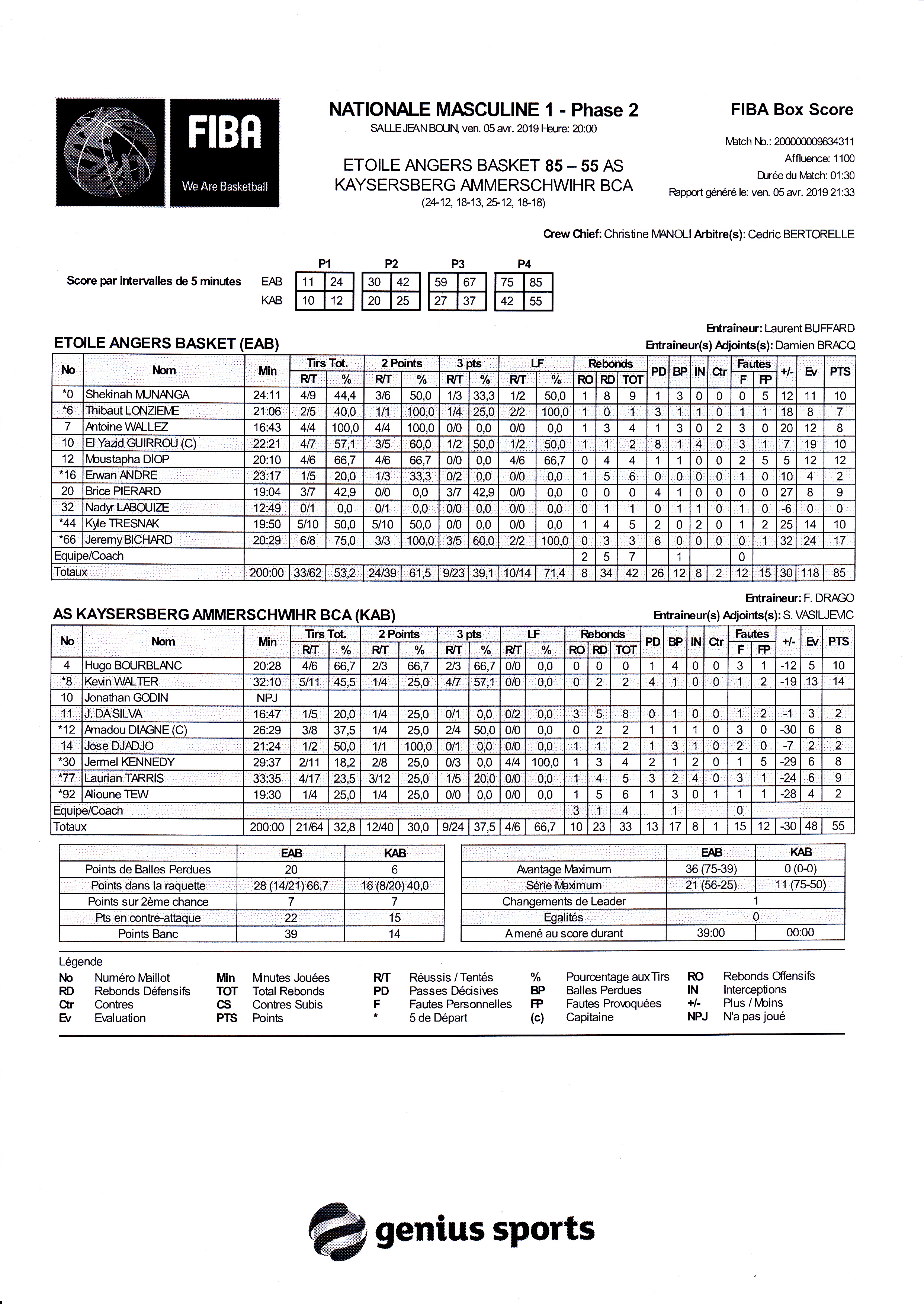 Angers va bien entamer le match avec un 4-0, puis avec un tir extérieur de Bichard (7-3, 2’46). Sur une approximation au milieu du terrain entre Bichard et Munanga, Tarris en profite pour récupérer le ballon et partir marquer un panier tout seul (7-5, 3’28). Le début de match est équilibré, mais les premiers signes, dus aux manques de rotation, vont commencer à se faire sentir dans le camp visiteur. Suite au jumpshot de Kennedy (13-12, 6’47), l’EAB va enchaîner un 11-0 pour mener de douze points au bout de dix minutes de jeu (24-12, 10′). Diagne stoppe l’hémorragie, où sur une belle feinte, il enchaîne sur un tir à trois points (24-15, 11’29). Suite un superbe mouvement collectif, Guirrou conclut un 5-0 (30-15, 14’10), mais les Kaysersbergeois réagissent avec un 5-0 en leur faveur par l’intermédiaire de Walter (30-20, 14’57). Angers maîtrise bien son sujet et Bichard va réussir, au buzzer, son deuxième tir extérieur de la soirée, donnant encore plus d’ampleur au score (42-25, 20′). Sur leur lancée, les Angevins vont continuer sur leur dynamique et accroître leur avantage, face à un adversaire qui progressivement va baisser pavillon, d’un point de vue mental. L’EAB enfonce un peu plus la tête sous l’eau à son adversaire, avec un nouveau 14-0 conclut par Wallez (56-25, 23’41). Entre-temps, ce dernier se sera fait plaisir avec deux contres magistraux ! Diop fait lui aussi le spectacle avec un alley-oop pour pratiquement valider une nouvelle victoire de son équipe, au bout du troisième quart-temps (67-37, 30′). Le quatrième quart-temps sera long et anecdotique sur la finalité de la rencontre. L’Étoile Angers Basket enchaîne une troisième victoire de suite et reste dans ses objectifs du haut de tableau (85-55).