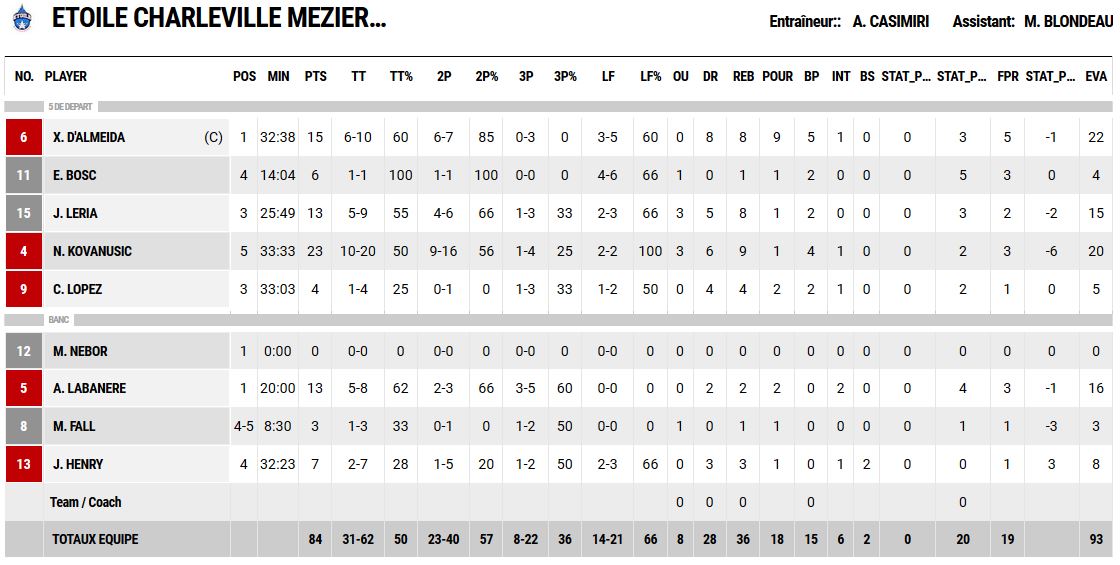 Étoile Charleville Mézières-Ardennes : D’Almeida (15), Bosc (6), Leria (13), Kovanusic (23), Lopez (4), Nebor (0), Labanère (13), Fall (3), Henry (7). Entraîneur : Alexandre CASIMIRI.