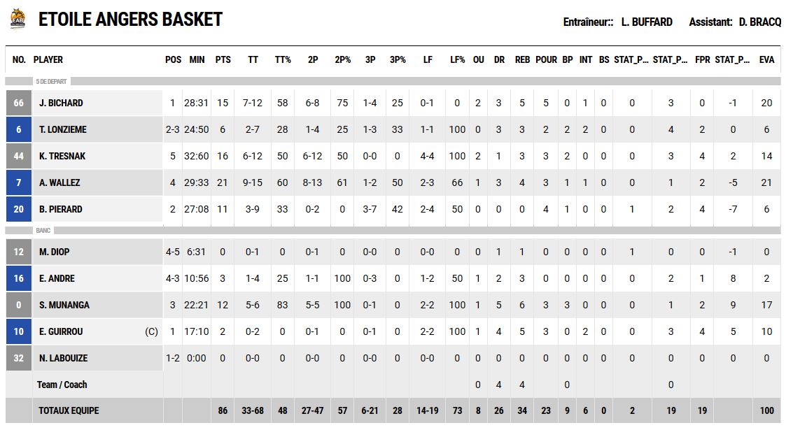 Étoile Angers Basket : Bichard (15), Lonzième (6), Tresnak (16), Wallez (21), Pierard (11), Diop (0), André (3), Munanga (12), Guirrou (cap.) (2). Labouize (0). Entraîneur : Laurent BUFFARD.