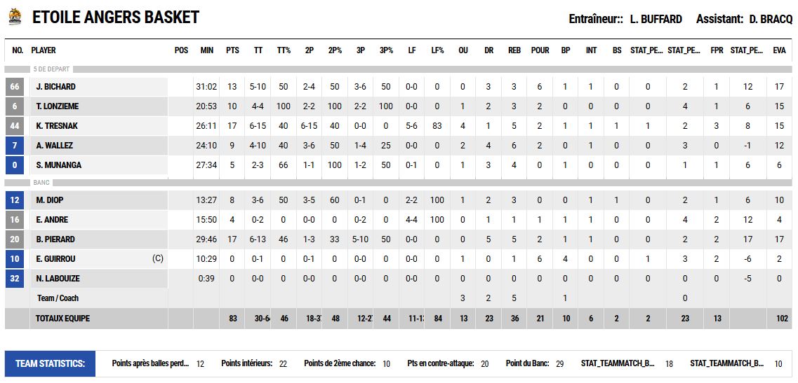 Étoile Angers Basket : Munanga (13), Lonzième (10), Wallez (9), Guirrou (cap.) (0), Diop (8), André (4), Pierard (17), Labouize (0), Tresnak (17), Bichard (13). Entraîneur : Laurent BUFFARD.