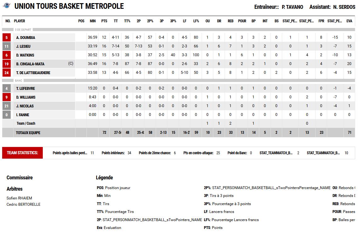 Union Tours Basket Métropole : Fanne (0), Lefebvre (0), Doumbia (12), Watkins (15), Williams (0), Lesieu (16), Cingala-Mata (cap.) (16), Nicolas De Lattibeaudière (13). Entraîneur : Pierre TAVANOS.