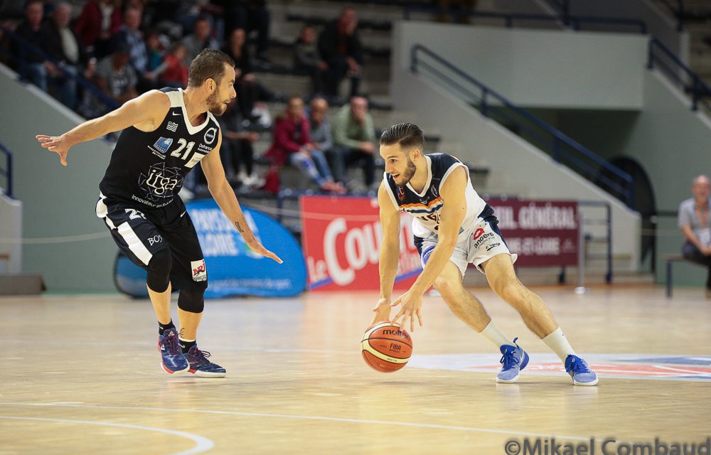 - Johan RATHIEUVILLE (Union Rennes Basket 35) face à Hugo SUCHARD (Angers BC). Crédit photos Mikaël COMBAUD.