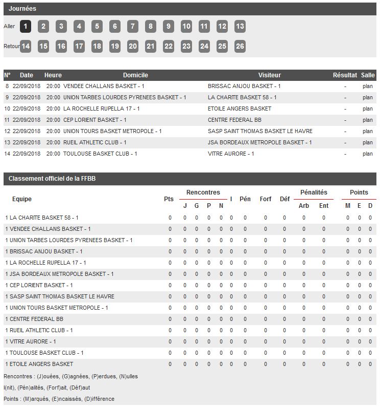 La Fédération Française de Basket-ball a dévoilé le calendrier du championnat de Nationale Masculine 1. Concernant les équipes du Maine-et-Loire, l’Étoile Angers Basket se déplacera à la Rochelle et Brissac Aubance Basket à Challans, lors de la première journée du championnat. Les rencontres auront lieu le samedi 22 septembre 2018, à 20h00. A noter que les deux formations seront dans la poule B, cette saison.