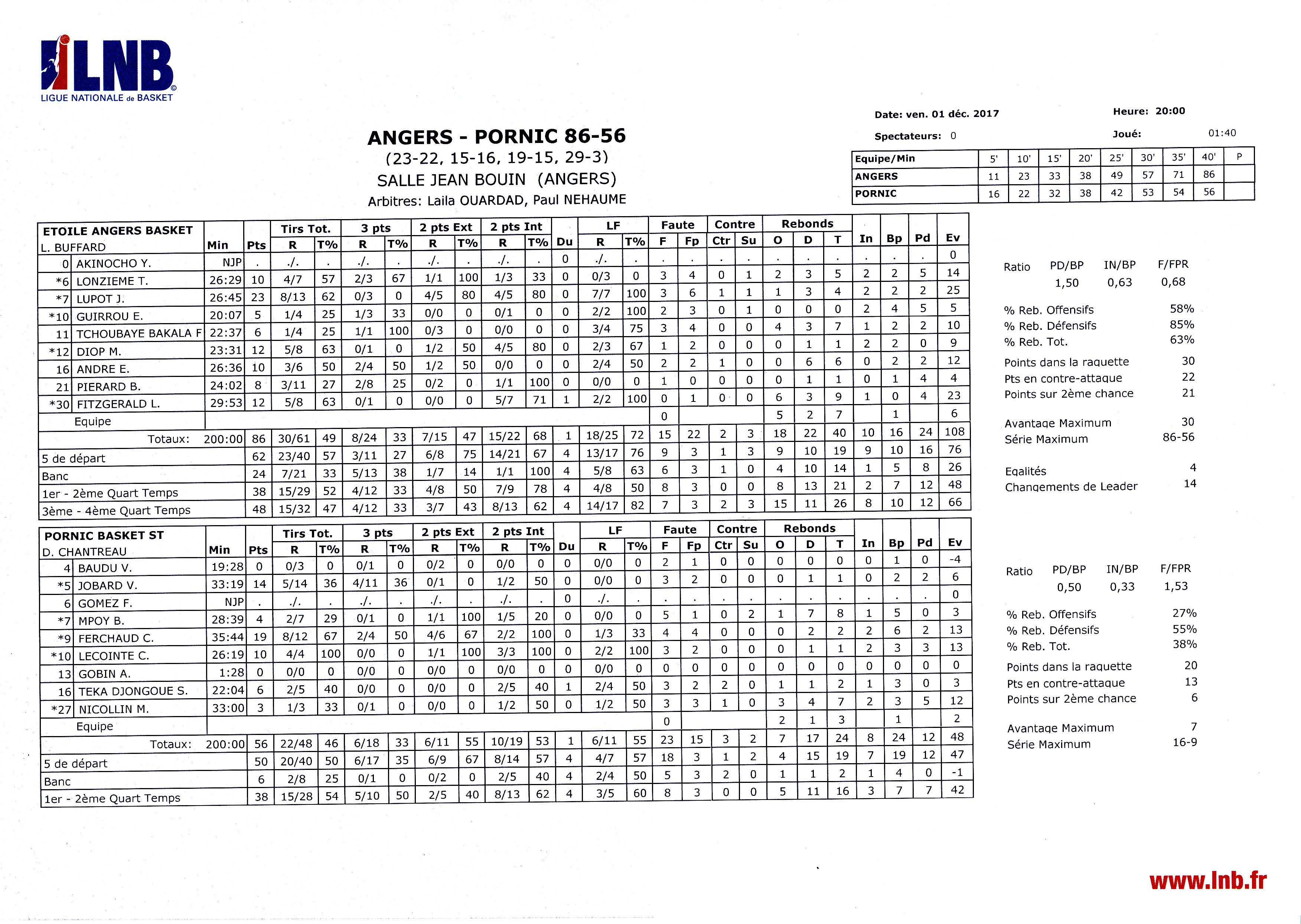 C’est un début de match très en réussite pour les visiteurs avec des tirs extérieurs sur cinq tirs réussis (9-15, 4’19). Pierard à trois points réduit la marque (16-20, 6’50). Le match est parti sur un bon rythme même si les Angevins ne sont pas complètement rentrés dans leur match. Les locaux peuvent compter sur Pierard, qui remet cela (21-22, 9′). Fitzgerald sur un beau service de Tchoubaye donne l’avantage à son équipe au buzzer (23-22, 10′). Fitzgerald fait le show d’entrée de deuxième quart-temps, enchaînant un dunk rageur, puis d’une tentative sans opposition, à la suite d’une contre-attaque (27-22, 11’20). André répond immédiatement à Ferchaud aux tirs extérieurs (31-29, 13’16). Encore Pierard qui permet à Angers de rester en tête (33-32, 15’14). Trois points de Jobard qui ajuste la mire (35-37, 17’50). Les Angevins n’arrivent pas à contrer la réussite de Ferchaud et Lecointe, auteurs à eux deux de 23 points (13 et 10). Fitzgerald donne un peu d’air à son équipe (49-42, 24’16). Dans la foulée, Pornic demande un temps-mort, pour couper l’élan angevin. Lupot conclut une belle action collective (51-42, 25’10). Ce dernier enchaîne en force (53-44, 26’37), puis un deux points (55-46, 27’17). Il vient d’inscrire six points consécutifs pour son équipe et il deviendra meilleur marqueur de son équipe, après trente minutes (14 points). Jobard réduit la marque au buzzer et relance complètement son équipe (57-53, 30′). Interception de Lonzième, qui sert Lupot qui n’a plus qu’à conclure, et donner dix unités d’avance aux locaux (63-53, 32′). Lonzième enfonce le clou sur un tir extérieur (66-53, 32’27). La rencontre est complètement à l’avantage de l’EAB qui déroule en mettant de la densité physique pour basculer la physionomie du match à son avantage. En face, les visiteurs sont pénalisés par les fautes, à l’image de M’Poy qui sort pour cinq fautes (35’34). Lupot profite d’une faute technique adverse pour creuser un écart important sur des lancés-francs (71-53, 35’54). Tchoubaye s’y met aussi à trois points, donnant vingt points d’avance aux locaux (74-54, 35’50). Ferchaud stoppe l’hémorragie dans la raquette (79-56, 36’42). André participe au festival (83-56, 37’15). Il n’y a plus qu’une seule équipe sur le parquet. L’écart va même monter pour atteindre les +30, au score final (86-56, 40′). Lupot finira meilleur joueur du match, étant l’auteur de 23 points et 25 d’évaluation.