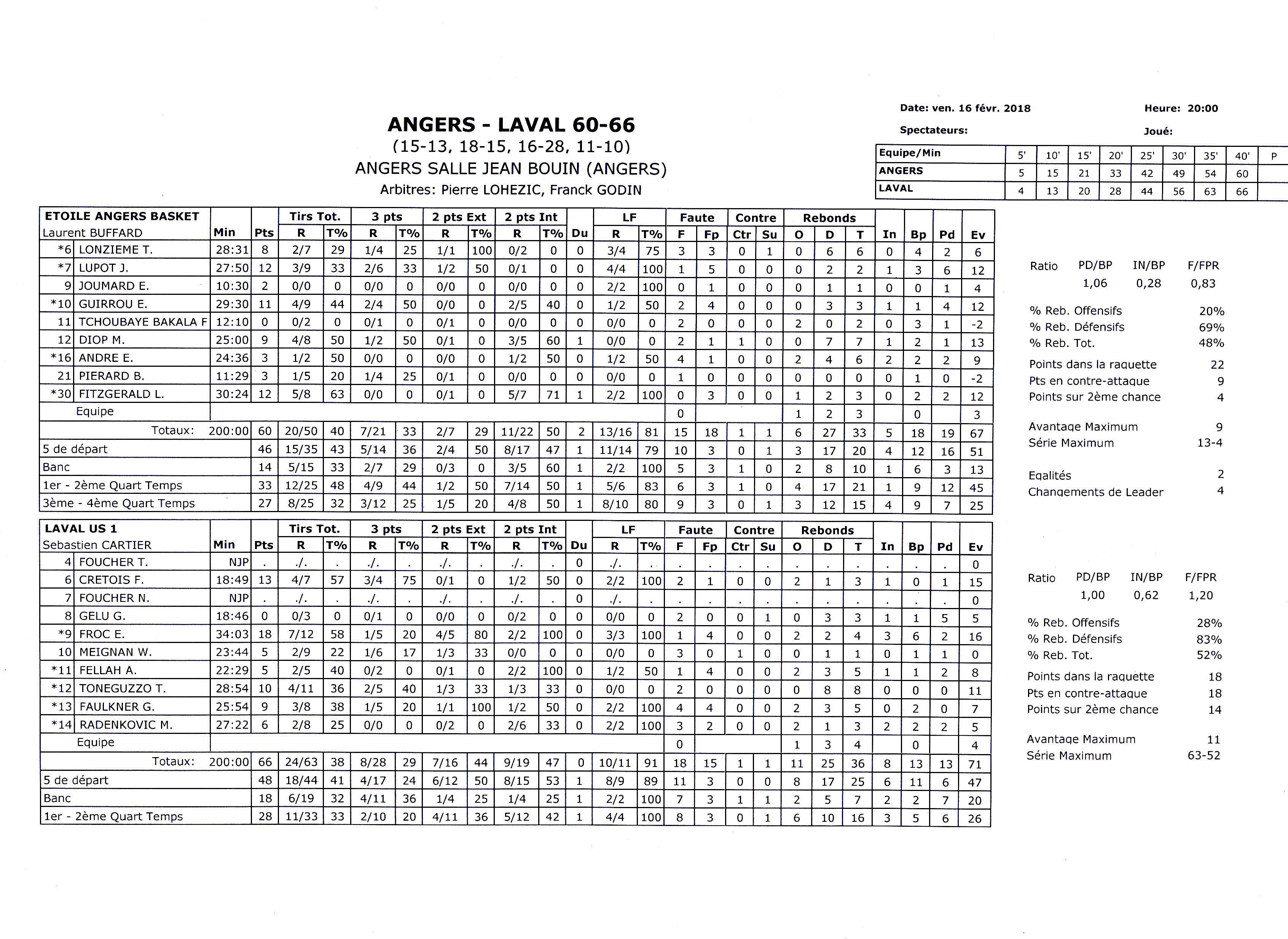 Fitzgerarld dans la raquette lance ce quatrième quart-temps (51-56, 30’26). Mais les Angevins s’énervent et ne font pas les bons choix. Crétois marque à nouveau sous le cercle (51-60, 31’33). Temps-mort pour Angers. Toneguzzo à trois points (52-63, 36’10). Lonzième réplique (54-63, 35’05). Les trop nombreuses fautes individuelles angevines sont exploitées à merveille par des Lavallois qui croient de plus en plus à la victoire. Faute anti-sportive de Fellah, Lupot réussit ses deux lancer-francs et récupère la possession de balle (56-65, 36’57). Temps-mort pour Laval, à trois minutes de la fin de la rencontre. On arrive dans le money-time et tout va se jouer. Bien décalé en position idéale par Guirrou, Pierard a tout le temps pour ajuster la mire derrière la ligne des 6,25m (60-65, 38’08). A une minute de la fin, Pierrard manque la balle de match qui aurait pu faire revenir son équipe à deux points. Il reste 26 secondes à jouer et Laurent Buffard demande un troisième et dernier temps-mort afin de tenter le tout pour le tout. Pierrard a une nouvelle balle de match face au panier, mais il manque à nouveau son tir extérieur, pourtant sans opposition, à vingt secondes de la fin. C’est au tour du camp lavallois de demander un temps afin de gérer la fin du match à leur avantage. Suite à une perte de balle angevine, Faulkner est trop facile et manque son dunk. Mais finalement, Laval s’impose logiquement au bout du suspense, tant les Angevins auront manqué d’imagination dans la rencontre (60-66). Après cette nouvelle défaite, les Angevins vont vite devoir se remobiliser, car ils ont grillé tous leurs jokers d’ici la fin de saison.