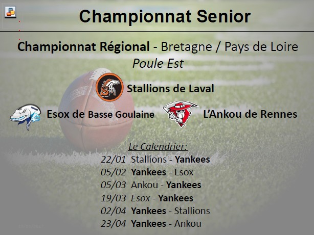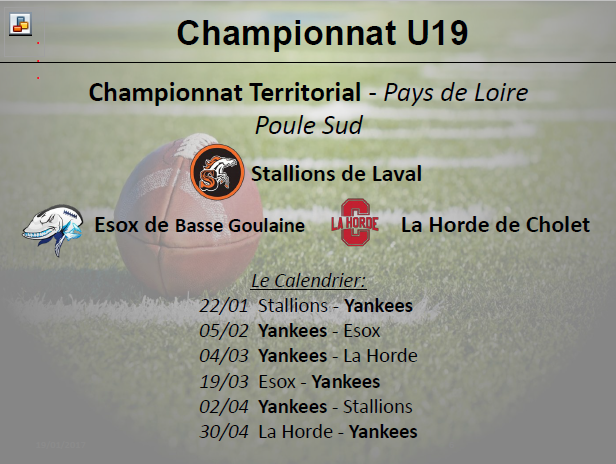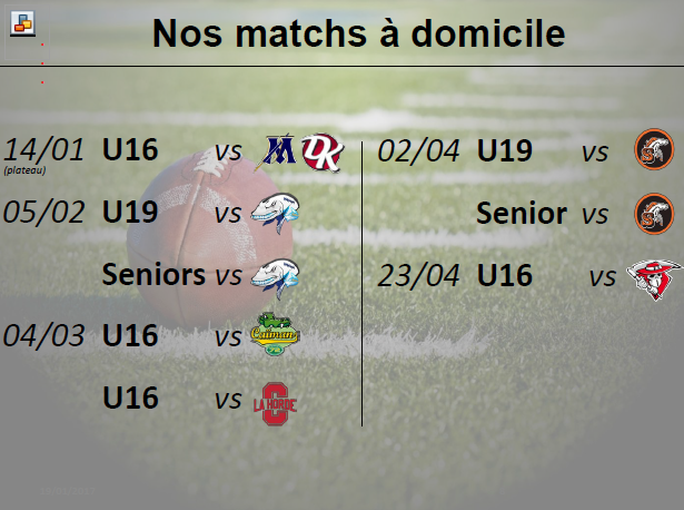 Voici un tableau récapitulatif des rencontres, qui auront lieu à domicile, au stade Marcel Nauleau, (boulevard Lucie et Raymond Aubrac). Trois journées ont été organisées pour qu’il y ait deux sections, qui jouent l’une après l’autre. Ce sera l’occasion d’avoir trois belles journées de football Américain, dans une ambiance festive.