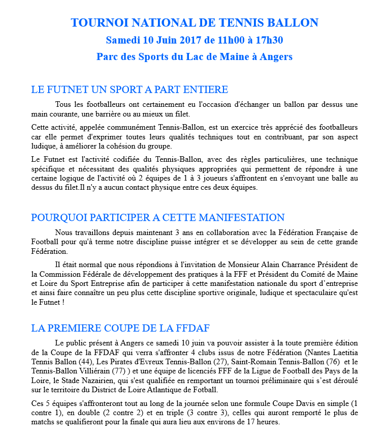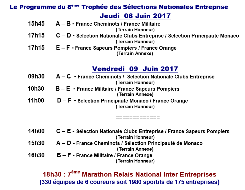 Le 8e Trophée des Sélections Nationales du Football d’Entreprise se déroulera du Jeudi 8 Juin au Samedi 10 Juin 2017, au Parc des Sports du Lac de Maine à Angers.
