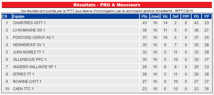 La Vaillante avait sans doute déjà la tête à son match de la finale retour de coupe d’Europe ETTU, de Vendredi prochain, contre la Romagne. Ils ont été battus sèchement par une équipe de Cergy Pontoise, qui ne leur a laissé aucune chance (3-0). Battu sur le même score en coupe d’Europe, les coéquipiers de Lebesson n’auront plus de droit face à la Romagne du trio : Wei Shihao, Chen Tianyuan et Adrian Crisan, s’ils veulent un nouveau titre de champion d’Europe. Dans le match au sommet de Pro A, ces derniers avaient sans doute aussi la tête à Vendredi, car ils se sont, eux aussi, inclinés à domicile face à au leader Chartrais (0-3). Du coup Cercy-Pontoise leur récupère la seconde place au classement, à deux journées de la fin du championnat.