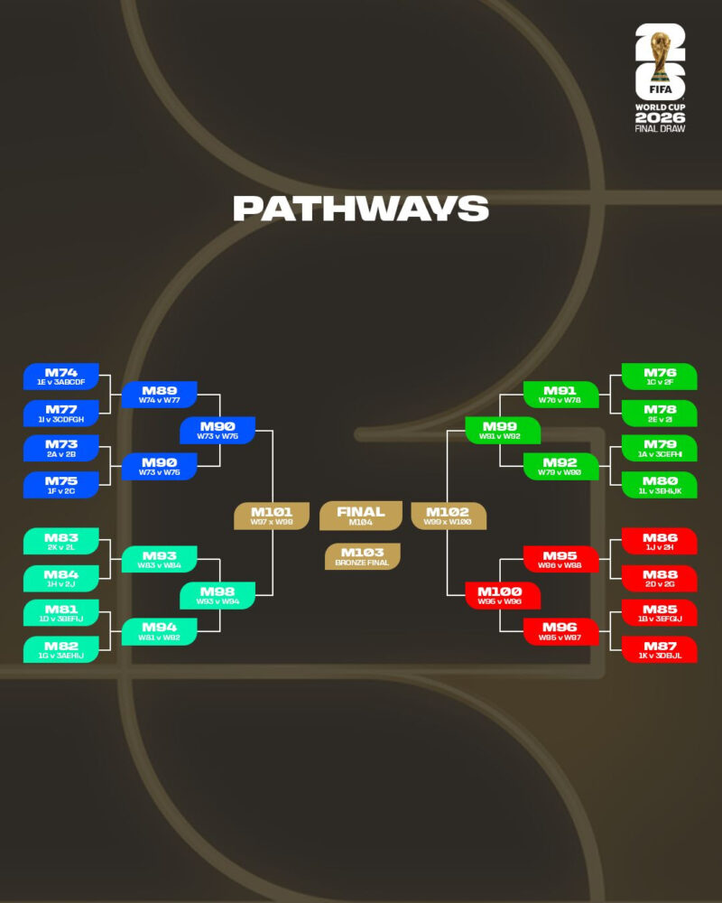 Afin de garantir l’équilibre compétitif, deux tableaux distincts vers les demi-finales ont été établis au moment de concevoir le calendrier des matches. Pour une répartition équilibrée, les contraintes suivantes s’appliqueront aux quatre équipes les mieux placées au Classement mondial masculin FIFA/Coca-Cola : l’équipe la mieux classée (Espagne) et la deuxième équipe la mieux classée (Argentine) se verront aléatoirement attribuer des tableaux opposés ; le même principe s’appliquera à la troisième (France) et la quatrième (Angleterre). À condition de terminer en tête de leur groupe, les deux équipes les mieux classées ne se rencontreront donc pas avant la finale.