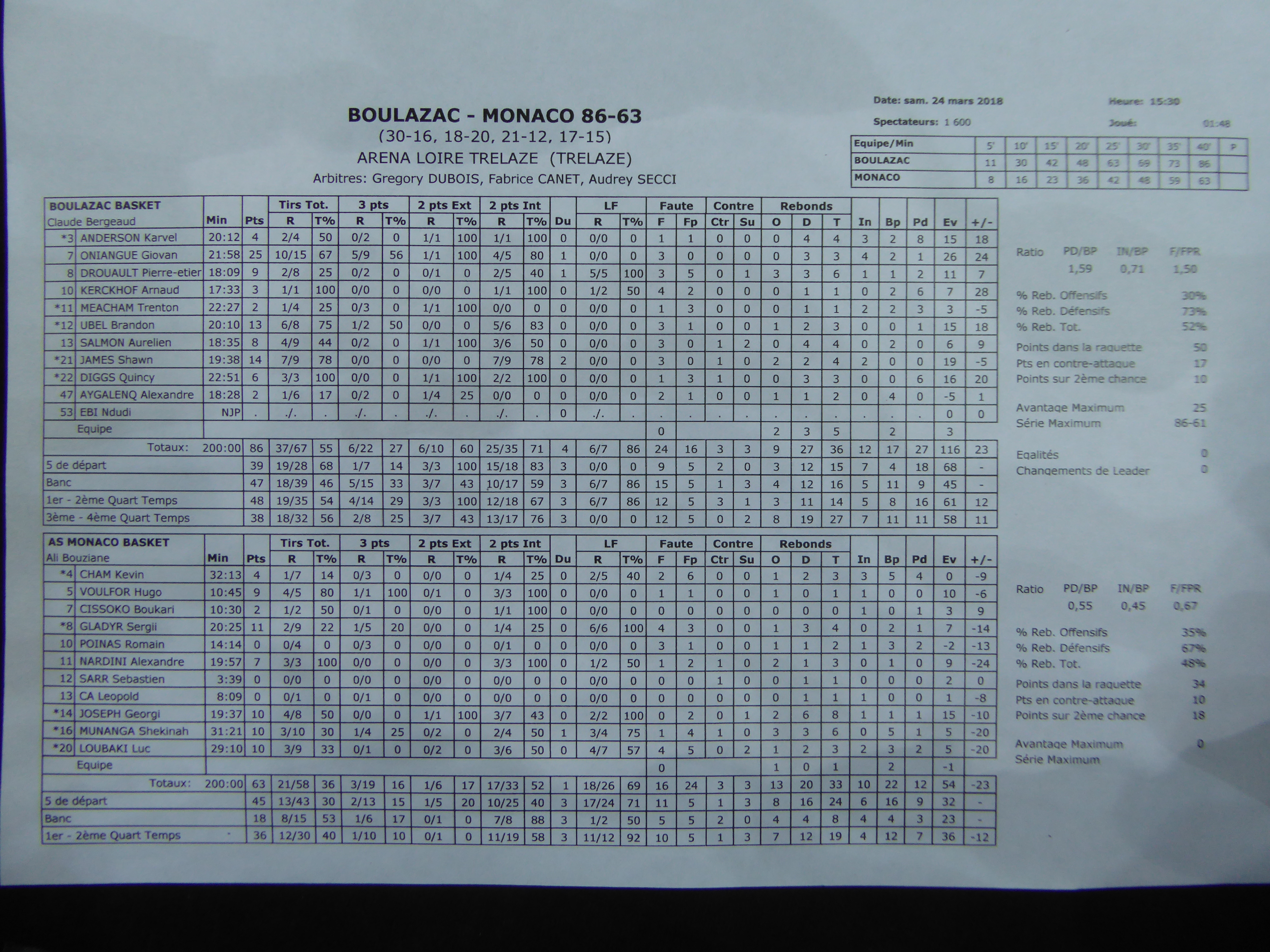 Boulazac Basket Dordogne (Jeep Élite) – AS Monaco Basket (Jeep Élite) : 86-63 (MT : 48-36)