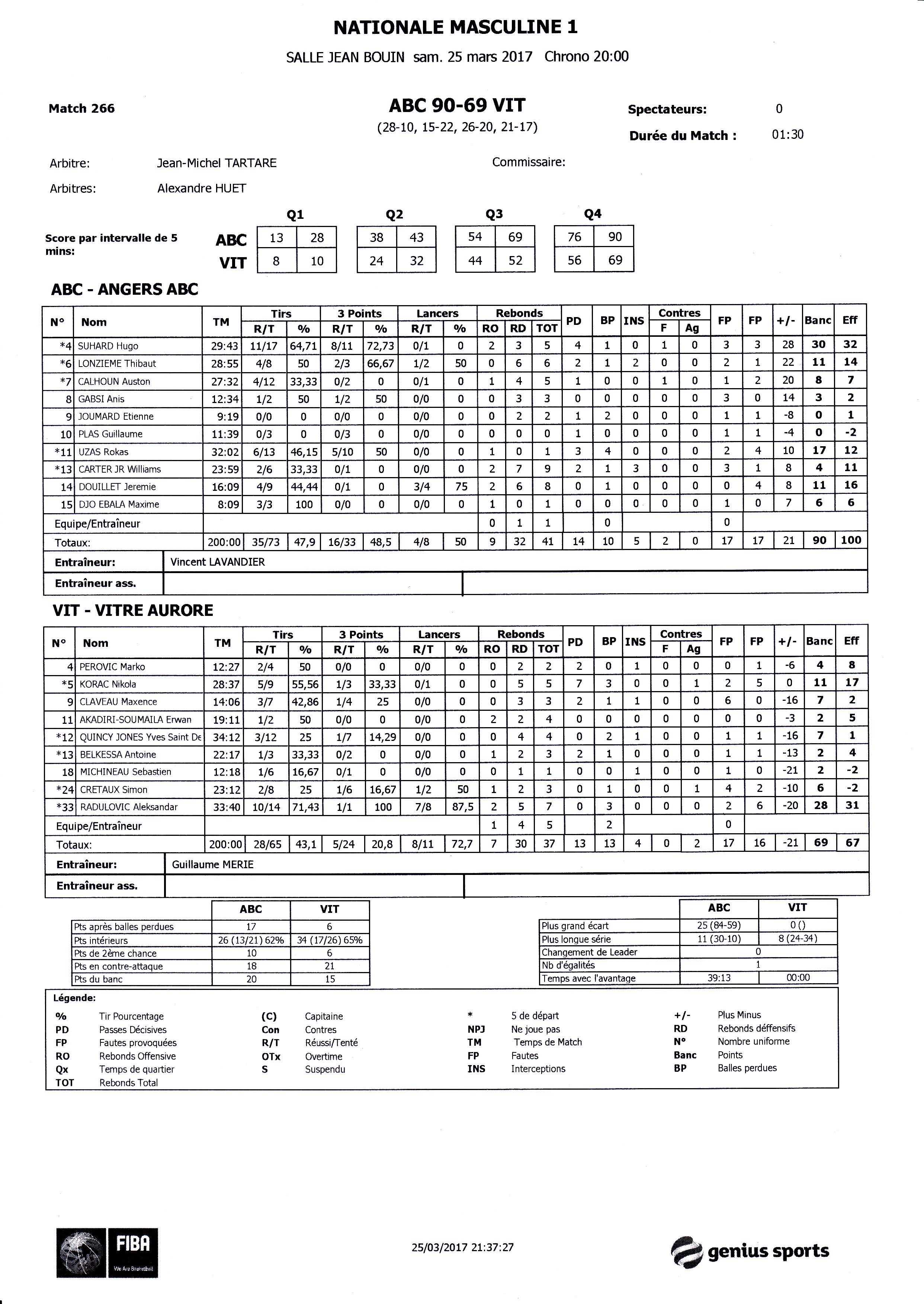 Vitré Aurore : Perovic (4), Kovac (11), Claveau (7), Akadiri-Soumaila (2), Quincy-Jones (7), Belkessa (2), Michineau (2), Cretaux (6), Radulovic (28).