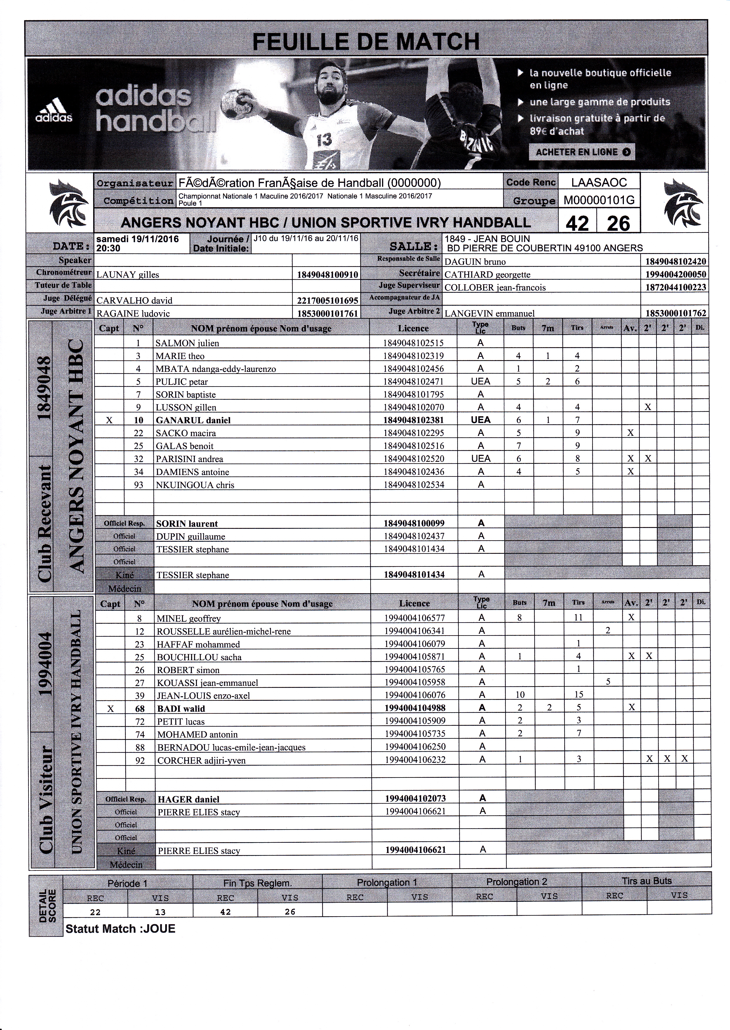 Angers Noyant Handball Club – US Ivry Handball : 42-26