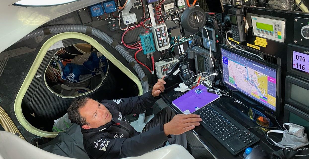 Comme toujours avec Romain, la bataille sur les océans ne lui fait pas oublier le bonheur d’être là. C’est le cas quand des dauphins noirs et blancs s’amusent dans le sillage de PURE-Best Western. C’est le cas aussi quand il s’offre un shampoing bien mérité, qu’il promet à la maitresse de son fils de ne pas utiliser de gros mots, qu’il tourne la caméra pour montrer le sillage de son IMOCA ou qu’il offre une visite improvisée de l’intérieur de son monocoque. Il s’en veut de ne « pas arrêter de manger des barres chocolatées » et rêve autant d’un steak-frite que d’une douche. « Des semaines sans prendre de douche, c’est un peu raide », admet-il.