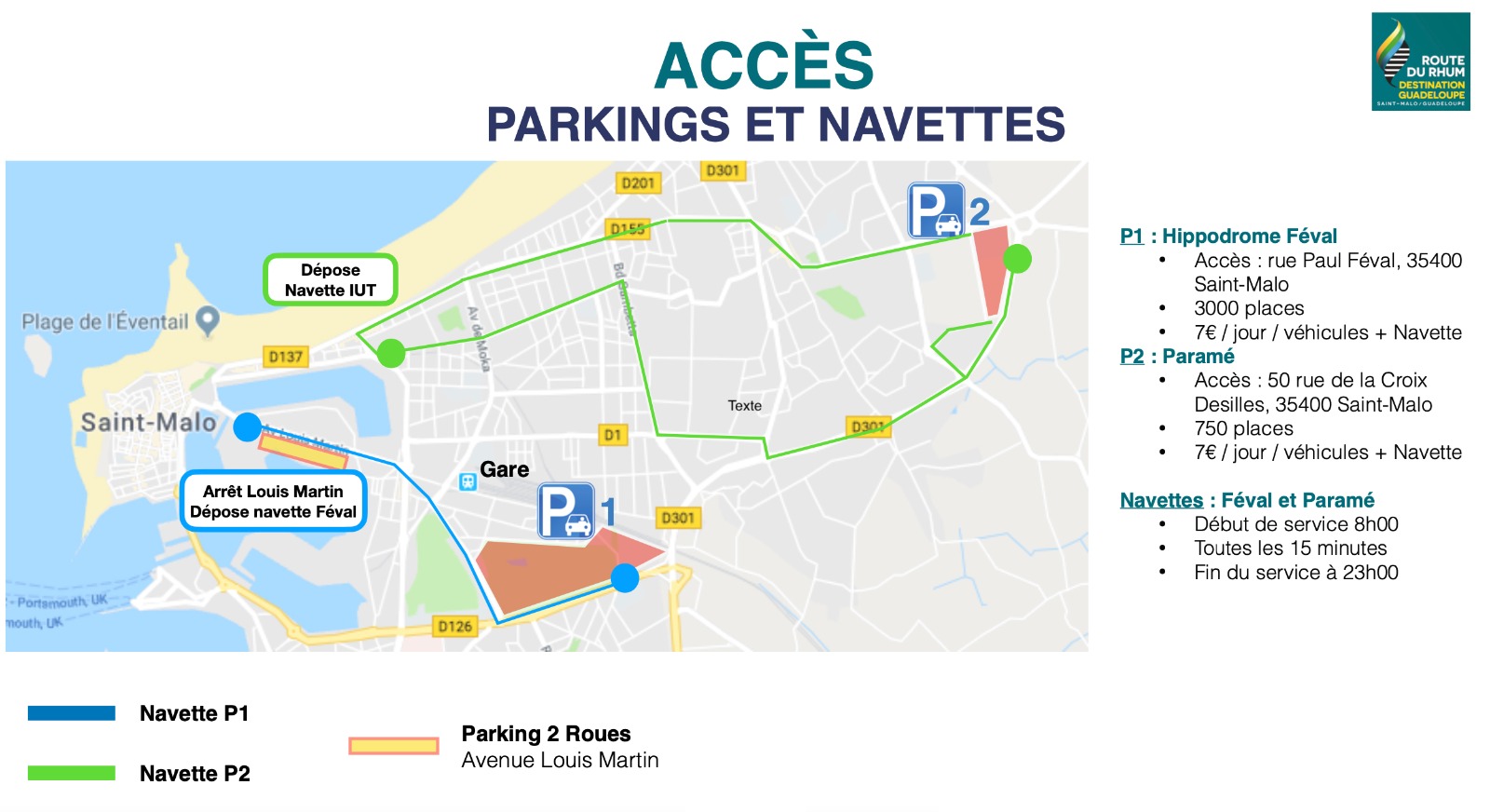 Voiture, train, vélo… autant de moyens qui permettront à l’ensemble des visiteurs de participer à cette grande fête. Quatre parkings (payants) pour des véhicules seront disponibles et donneront accès aux navettes vers le village de La Route du Rhum – Destination Guadeloupe. Une navette desservira les arrêts, les parkings de l’Hippodrome Féval et Paramé, toutes les 15 minutes, de 8h00 à 23h00. Le réseau de bus de la Ville de Saint-Malo desservira également Rocabey et Louis Martin. Pour les voitures électriques, des bornes rechargeables seront mises à disposition par le Fournisseur Officiel Emeraude Solaire au Parking Relais Paul Féval. StadiumGO, partenaire de l’événement propose une solution de covoiturage pour les trajets à destination du village.