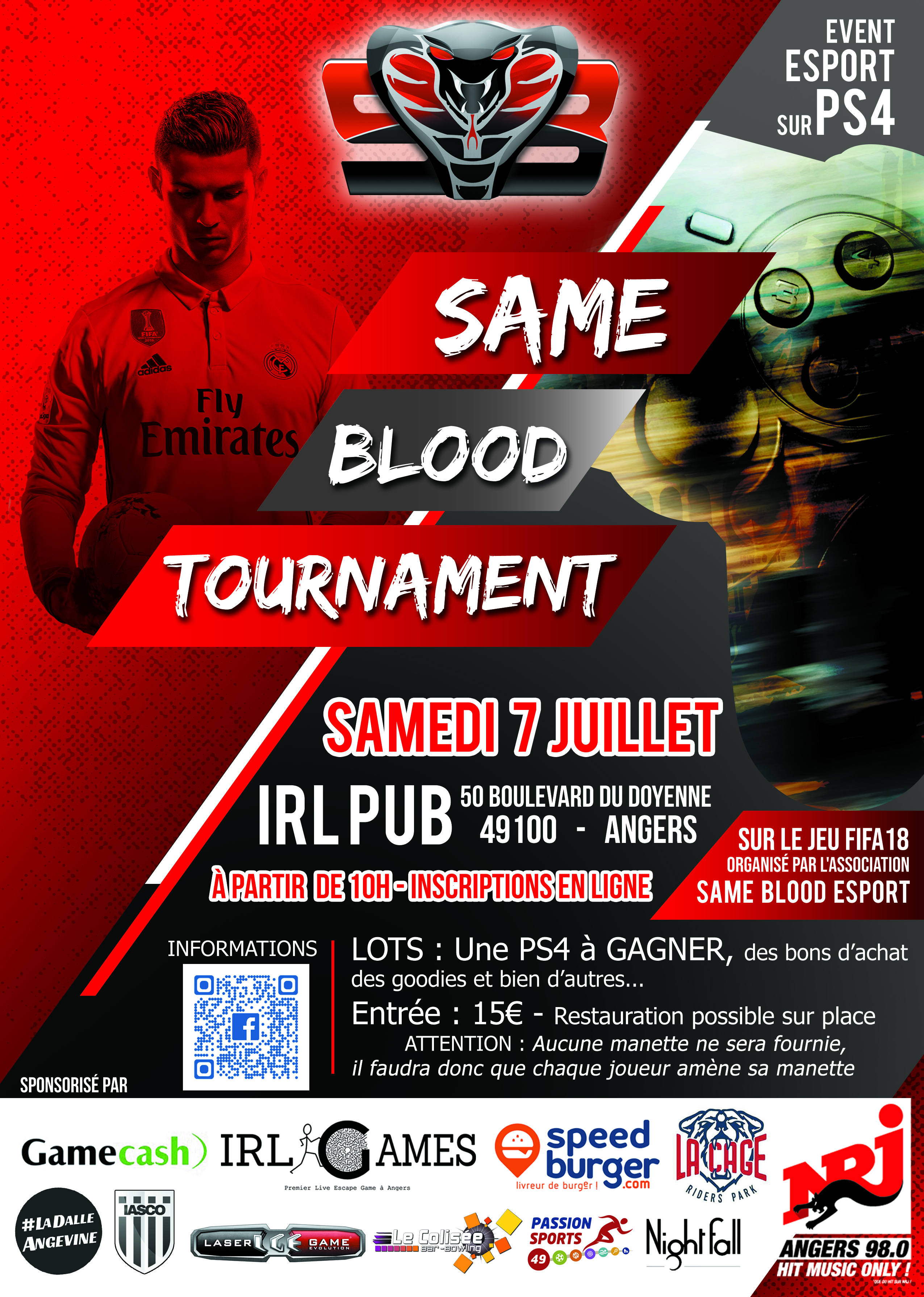 L’association Same Blood E-Sport organise le samedi 7 juillet, un tournoi de jeu vidéo de football virtuel FIFA 18 sur Playstation 4. Plus de 500€ de lots minimum dont une PS4 à gagner pour le vainqueur du tournoi !