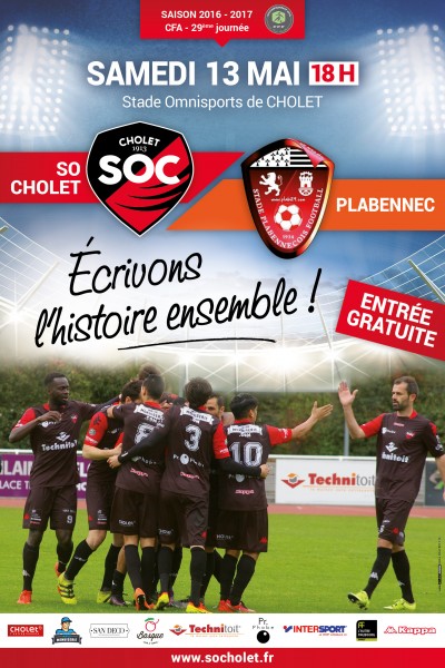 A l’occasion du dernier match de la saison à domicile, le SO Cholet invite tous ses supporters au Stade Omnisports, pour fêter ses champions, héros de la montée en National. Pour marquer l’événement, le club précise que l’entrée au stade sera « gratuite » pour tout le monde. Le club espère que les Choletais et tous les amateurs de football viendront nombreux au stade, ce samedi soir, pour fêter avec les joueurs, cette seconde montée en trois saisons.