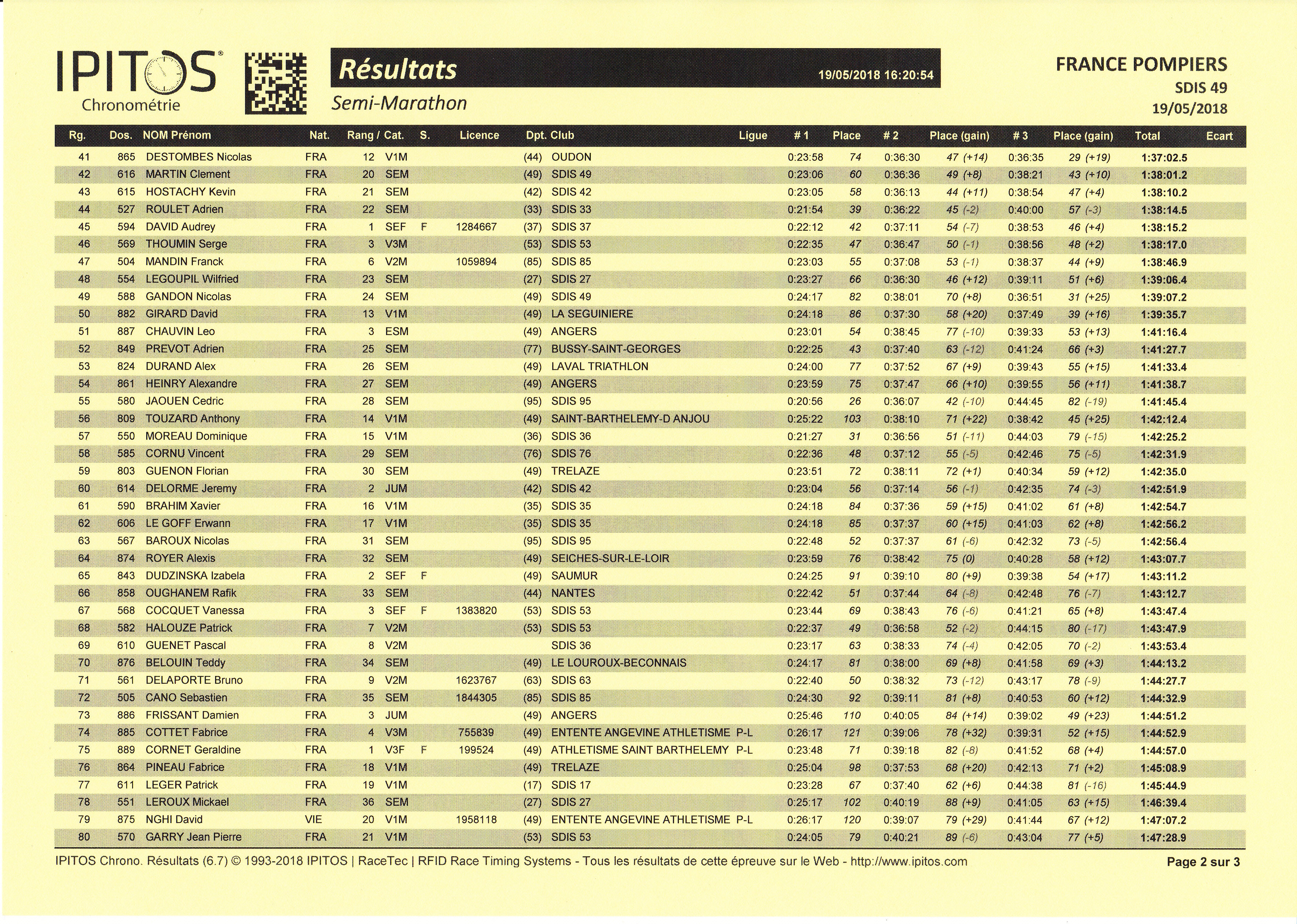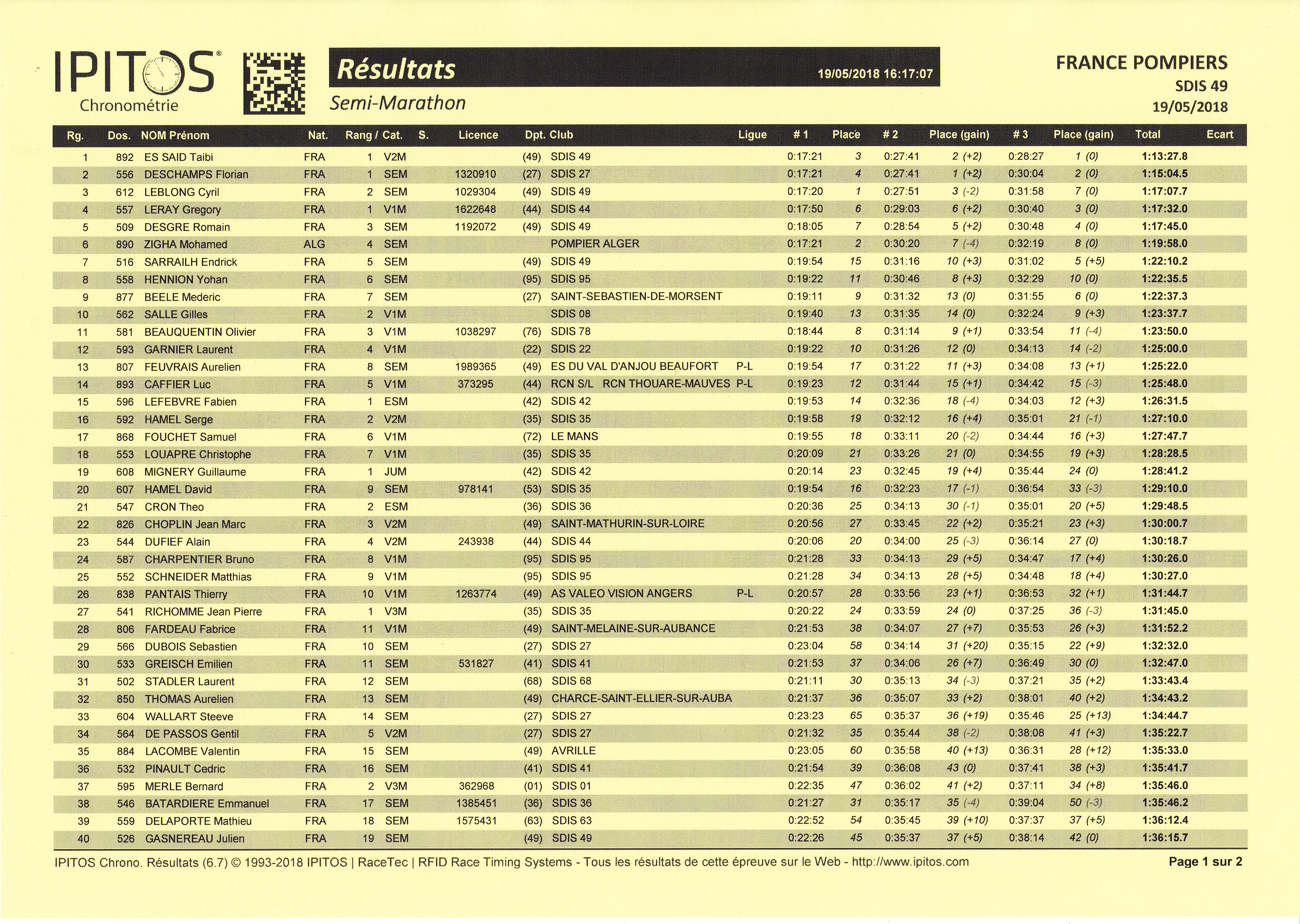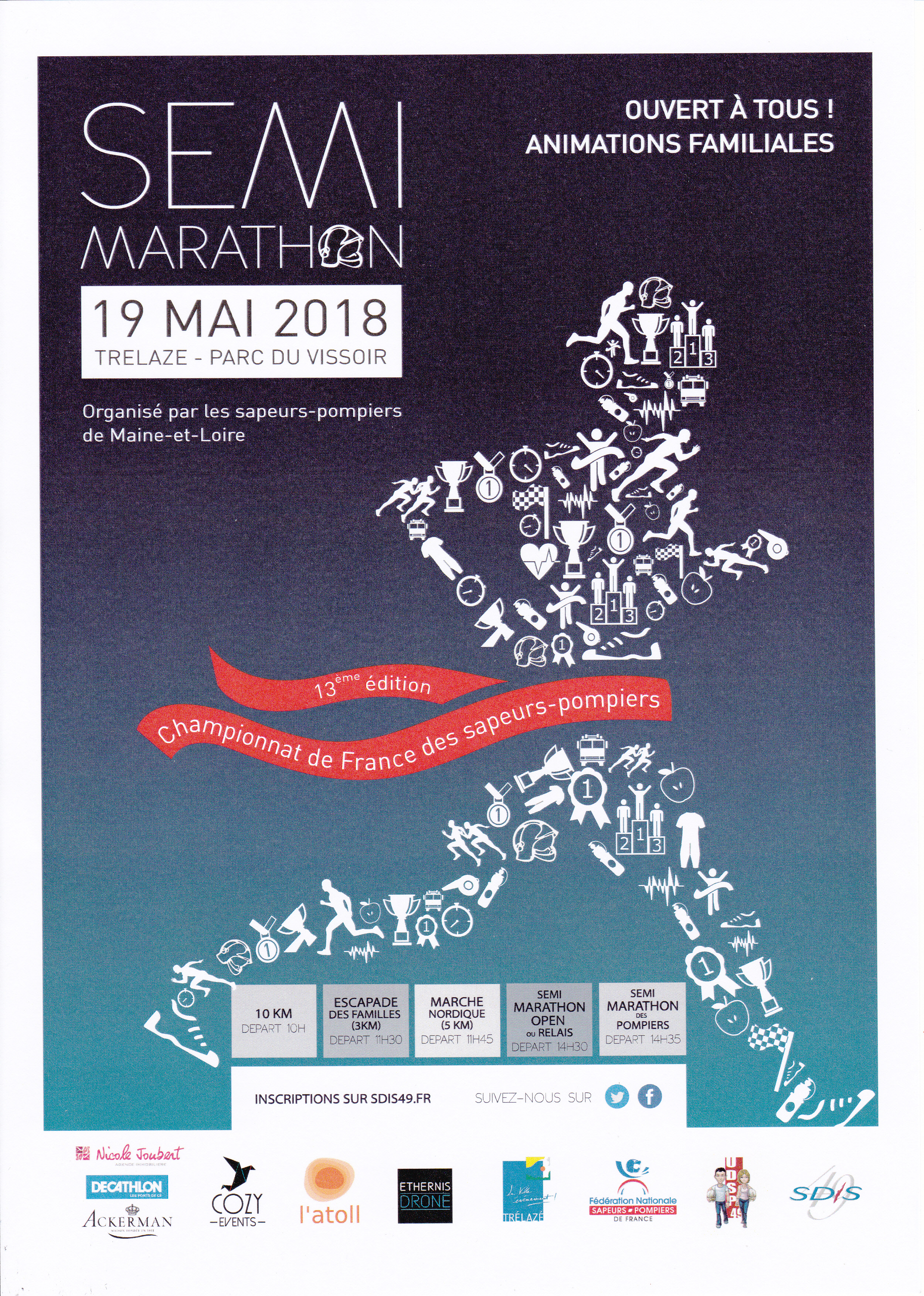 La treizième édition du championnat de France des sapeurs-pompiers de semi-marathon s’est déroulée le samedi 19 mai 2018, au parc du Vissoir de Trélazé. Cette manifestation, organisée par les sapeurs-pompiers de Maine-et-Loire a été un véritable succès. Les festivités ont débuté à 10h avec le 10 km, puis à 11h30 avec l’escapade des familles (3 km), enfin la marche nordique a clôturé la matinée. En début d’après-midi avait lieu l’épreuve reine de la journée avec le semi-marathon open ou relais à 14h30. Le semi-marathon des sapeurs-pompiers a été donné cinq minutes après, à 14h35. Sous une forte chaleur et sur un parcours technique, les meilleurs se sont imposés.