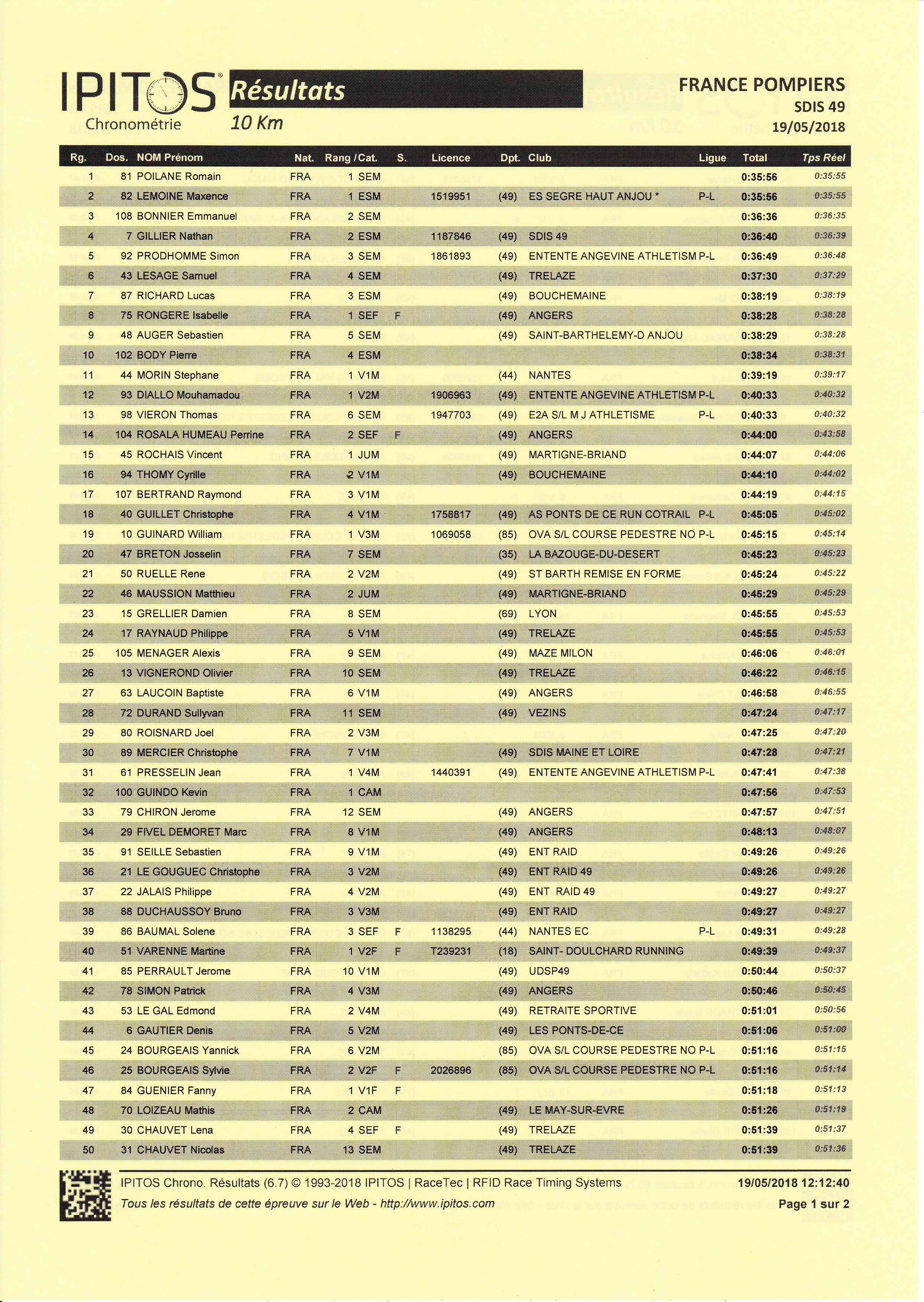 1er : Romain POILANE (35’56), 2e : Maxence LEMOINE (35’56), 3e : Emmanuel BONNIER (36’36), 4e : Nathan GILLIER (36’40), 5e : Simon PRODHOMME (36’49).