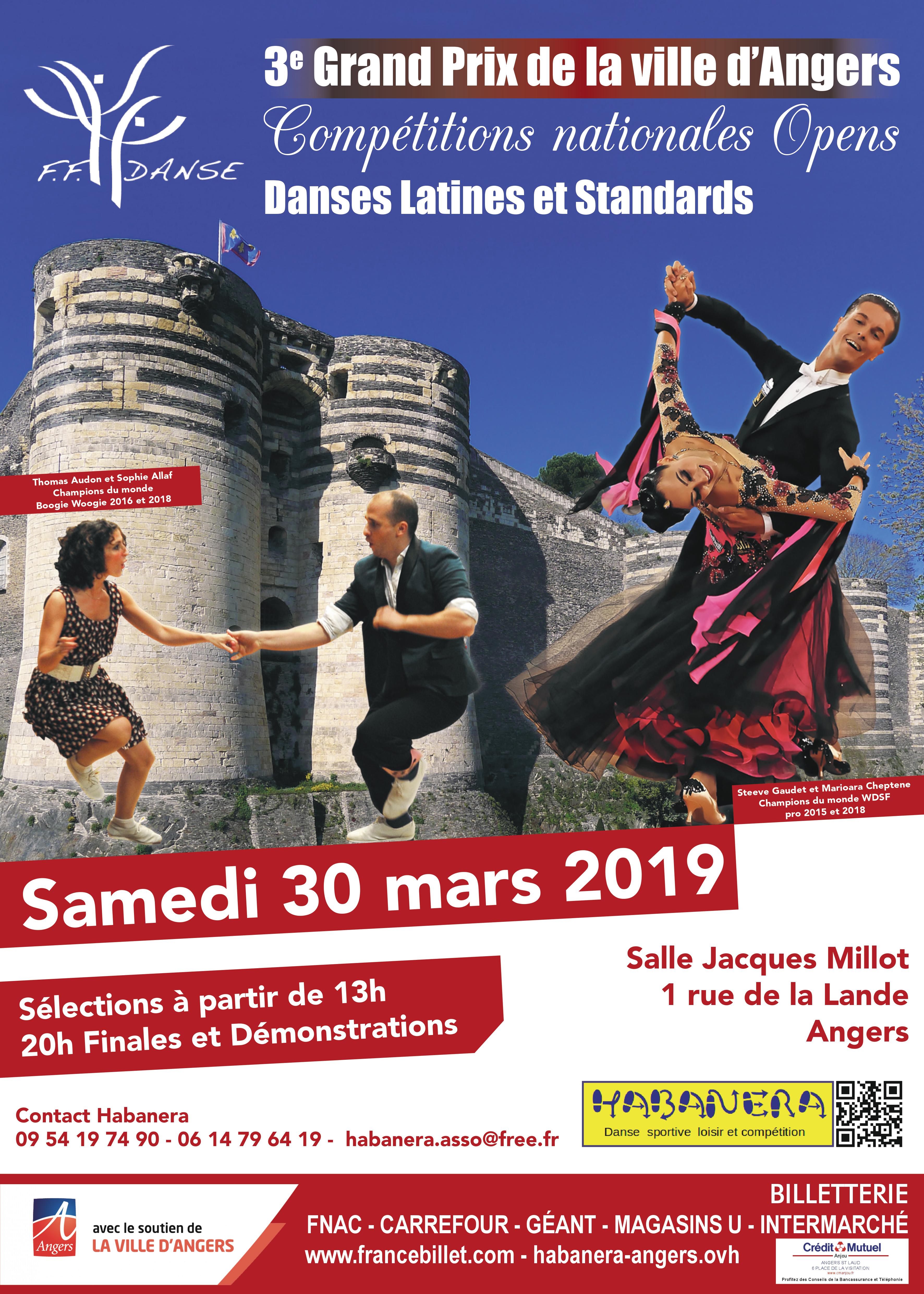 Le club de danse sportive Habanera organise ces compétitions, le samedi 30 mars 2019 à la salle Jacques Millot, 1 rue de la Lande à Angers. Les compétiteurs évolueront en danses latines (samba, chacha, rumba, paso doble et jive) et en danses standards (valse lente, tango, valse viennoise, slow fox et quickstep). Les sélections auront lieu à partir de 13h00.