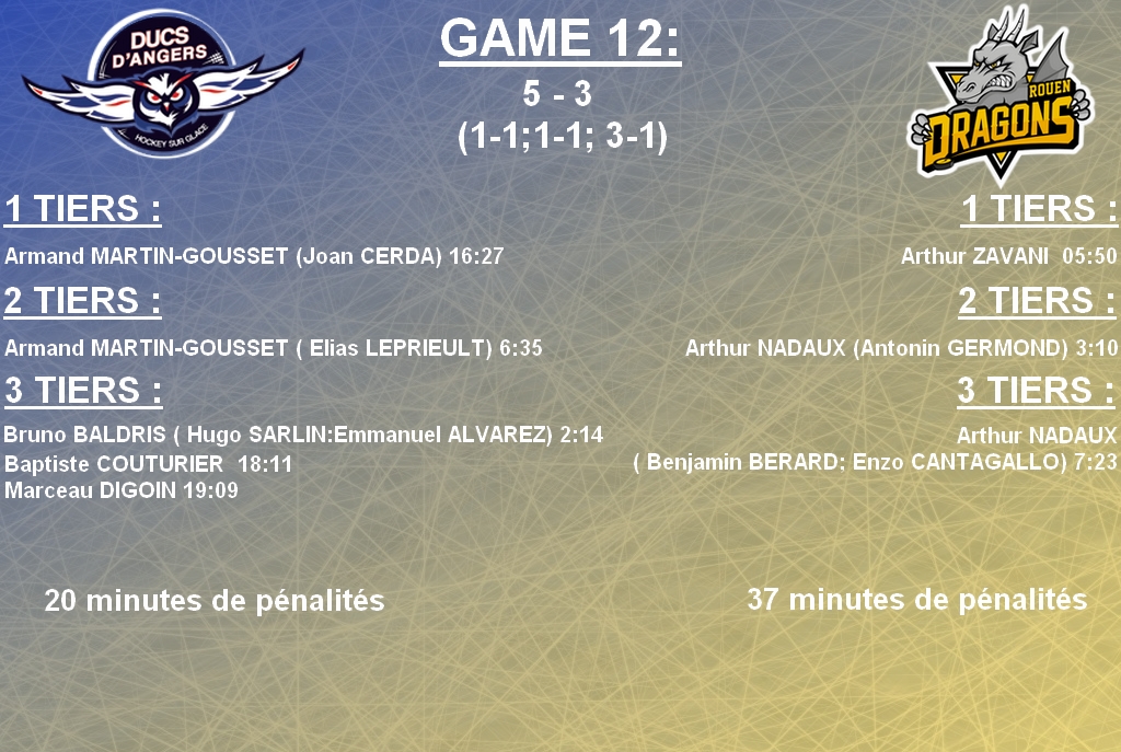 Ce match était intense. Les Rouennais ont pris l’avantage deux fois, lors des deux premiers tiers-temps. Les Angevins ont réagi par deux fois et ils ont fini les deux premiers tiers-temps à égalité avec les Dragons. Angers prend l’avantage dans le dernier tiers-temps et avec brio. Ils sont sus tenir et le match, qui a été physique, mais agréable à regarder.