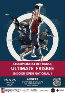 Les 25 et 26 janvier, le gymnase du SUAPS d’Angers sera le théâtre de la phase finale du Championnat de France Indoor (en salle) d’Ultimate Frisbee dans la catégorie mixte. Venez découvrir les douze meilleures équipes françaises qui s’affronteront pour décrocher le titre national.